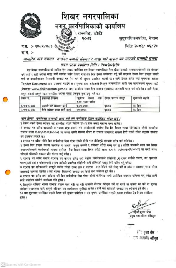 आन्तरिकआय संकलन अर्न्तगत कवाडी र माछा मारे वाफत कर उठाउने सम्बन्धी सूचना।